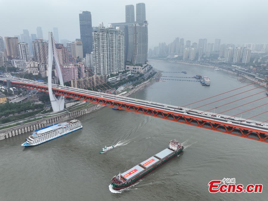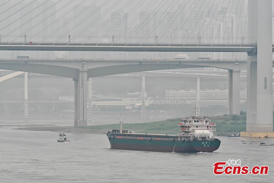 The Innovation 5 vessel passes through the Dongshuimen Yangtze River Bridge in Chongqing, becoming the first ship of its size to sail into the upper reaches of the Yangtze River, May 11, 2024. (Photo: China News Service/Guo Xu)