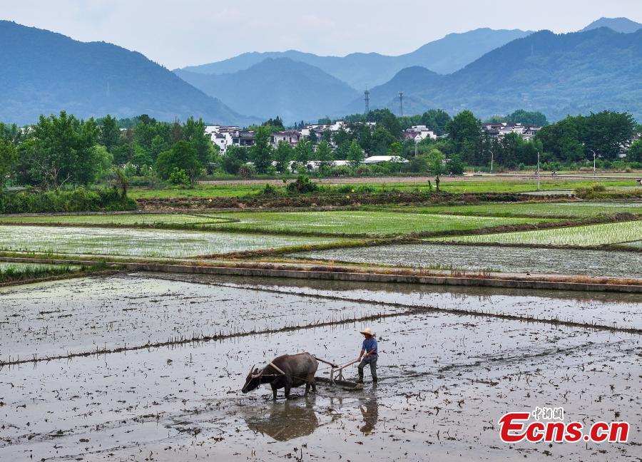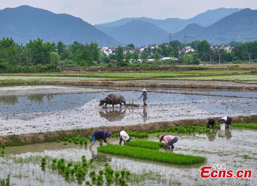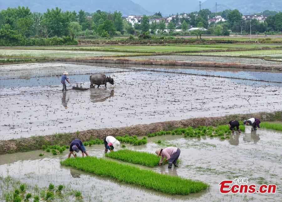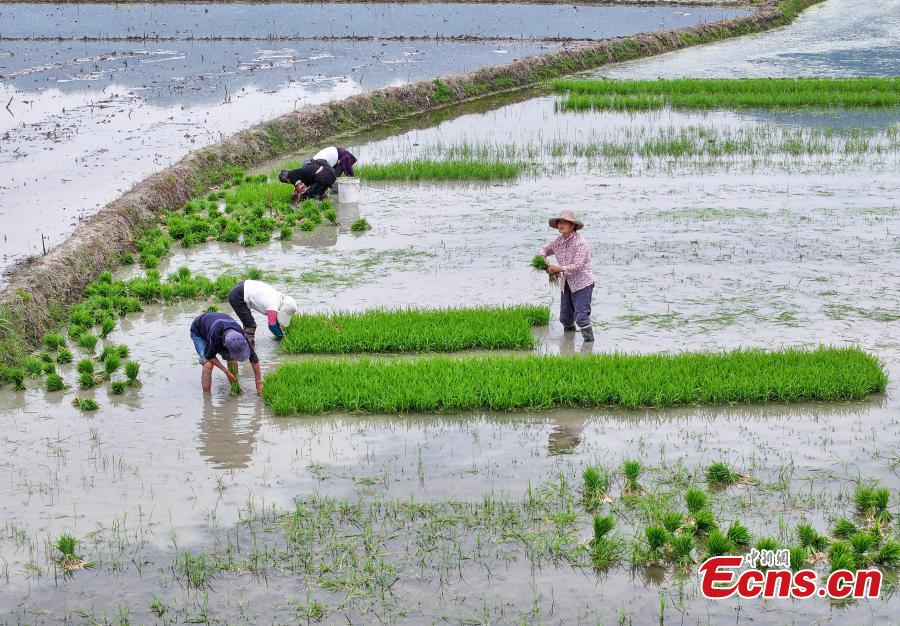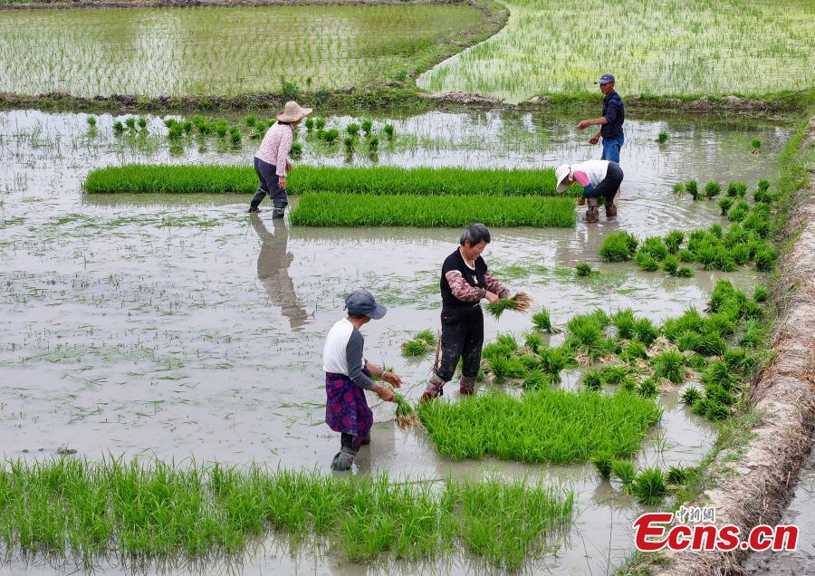 Villagers work on a rice field ahead of traditional Chinese solar term Xiaoman (grain buds) which falls on May 20 this year. (Photo: China News Service/Shi Yalei)
