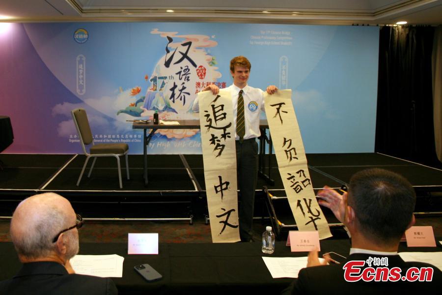 A contestant displays his Chinese calligraphy during the final round of the 17th "Chinese Bridge" Chinese Proficiency Competition for Foreign High School in Sydney, Australia, May 26, 2024. (Photo: China News Service/Gu Shihong)
