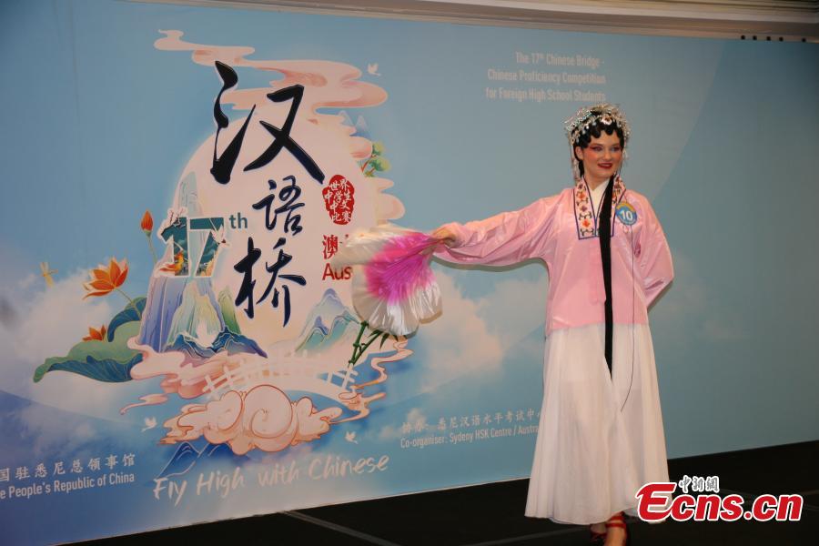 A contestant performs during the final round of the 17th "Chinese Bridge" Chinese Proficiency Competition for Foreign High School in Sydney, Australia, May 26, 2024. (Photo: China News Service/Gu Shihong)