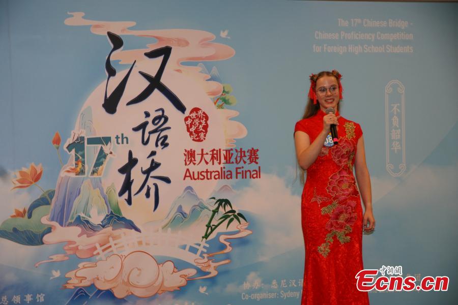 A contestant gives a speech during the final round of the 17th "Chinese Bridge" Chinese Proficiency Competition for Foreign High School in Sydney, Australia, May 26, 2024. (Photo: China News Service/Gu Shihong)