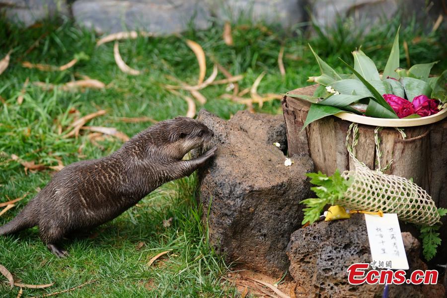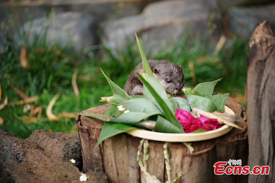 An otter enjoys special Zongzi ahead of the Dragon Boat Festival at Yunan Zoo in southwest China's Yunnan Province, June 5, 2024. (Photo: China News Service/Liu Ranyang)