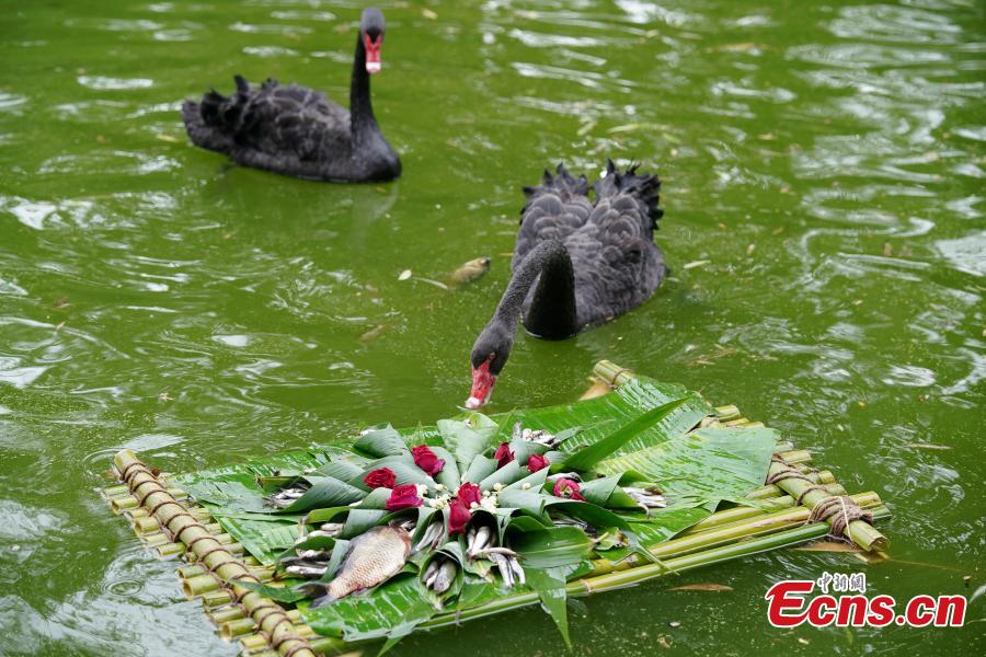 Black swans enjoy special Zongzi ahead of the Dragon Boat Festival at Yunan Zoo in southwest China's Yunnan Province, June 5, 2024. (Photo: China News Service/Liu Ranyang)