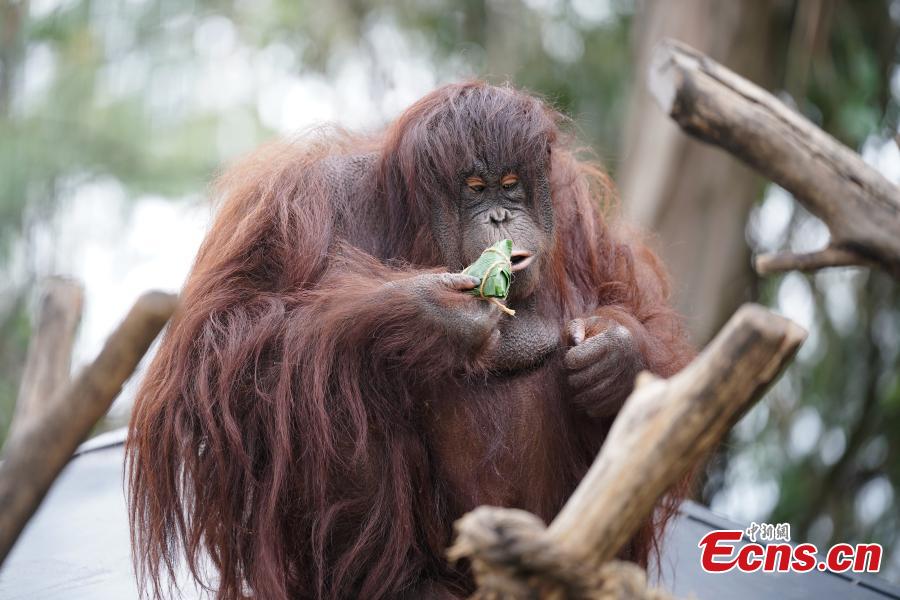 An orangutan enjoys special Zongzi ahead of the Dragon Boat Festival at Yunan Zoo in southwest China's Yunnan Province, June 5, 2024. (Photo: China News Service/Liu Ranyang)