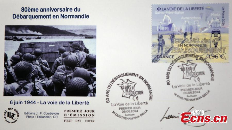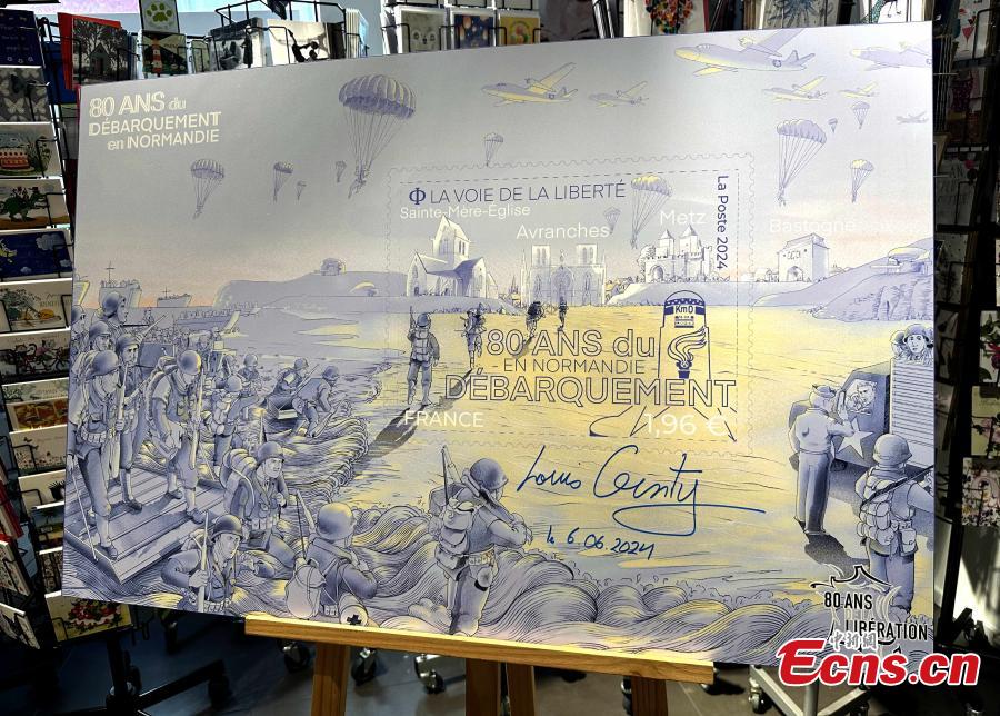 A commemorative stamp marking the 80th anniversary of the D-Day landings is displayed at a store in Paris, France, June 6, 2024. (Photo: China News Service/Li Yang)