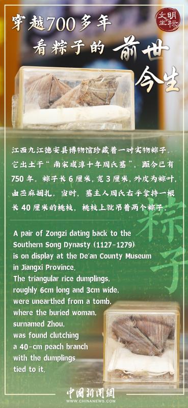 A pair of triangular rice dumplings in De'an County Museum in Jiangxi province, which are roughly 6cm long and 3cm wide, were unearthed from a tomb built during the Southern Song Dynasty (1127-1279). The woman buried in the tombwas found clutching a 40-cm peach branch with the dumplings tied to it.