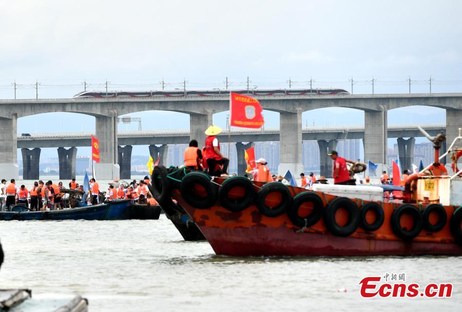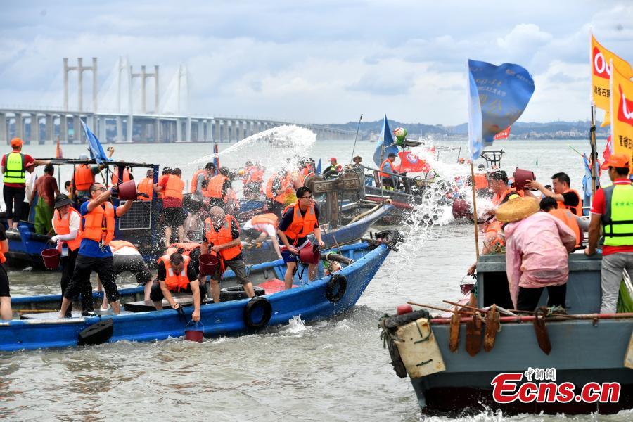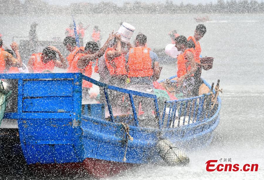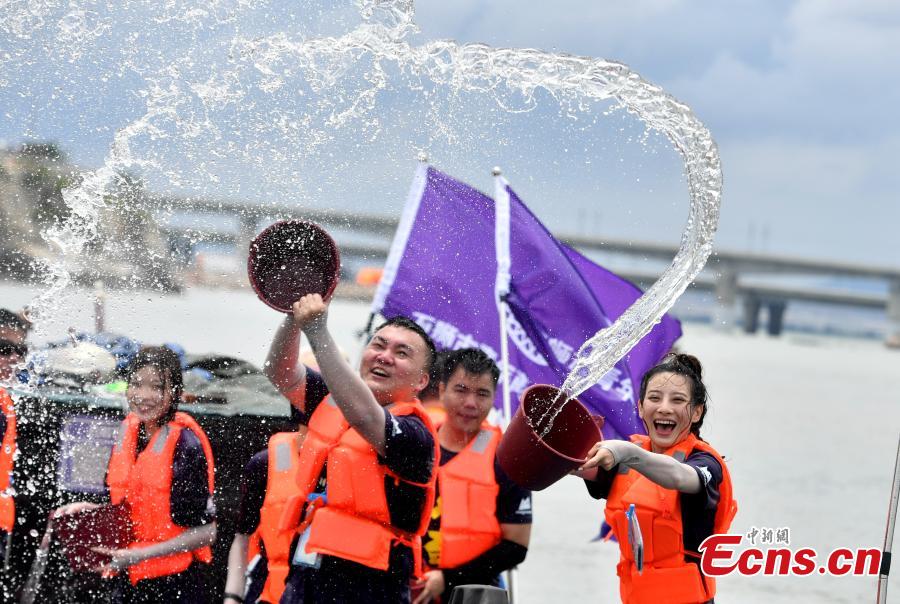The people from both sides of the Taiwan Straits splash water on the sea to welcome the Dragon Boat Festival in Shishi, Quanzhou, Fujian province on the Dragon Boat Festival, June 10. (Photo: China News Service/ Lv Ming)