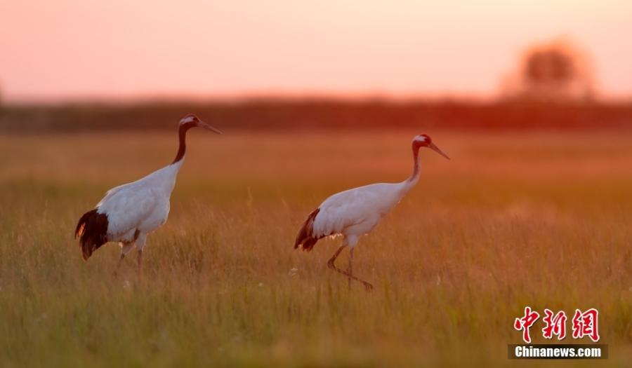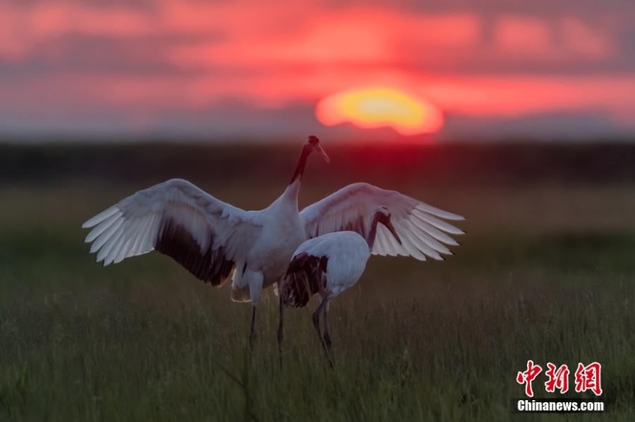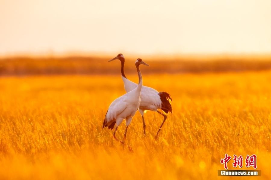 Wild red-crowned cranes search for food and play together in the Zhalong wetland, Daqing City, northeast China's Heilongjiang Province. (Photo/VCG)
