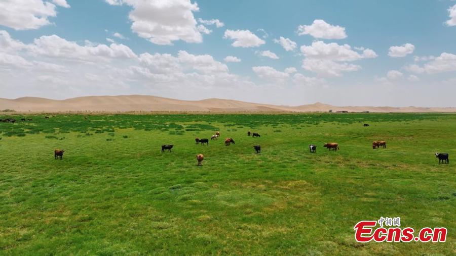 Cattle and sheep graze leisurely on green pastures in the Badain Jaran Desert in Alxa League, Inner Mongolia Autonomous Region in June. (Photo: China News Service/ Zhang Leyuan)