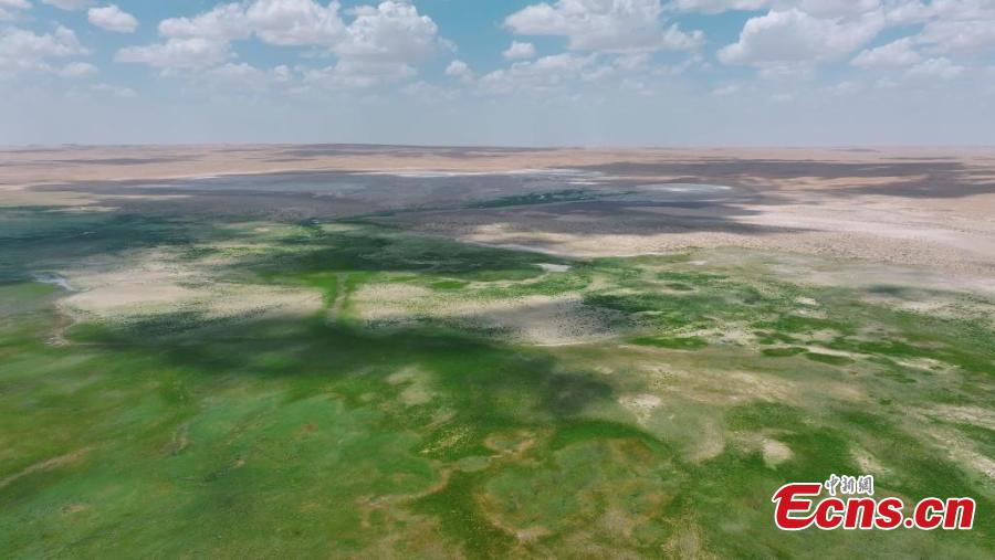 The blue sky, white clouds, and green grass on the Badain Jaran Desert constitute a beautiful ecological picture in Alxa League, Inner Mongolia Autonomous Region in June. (Photo: China News Service/ Zhang Leyuan)