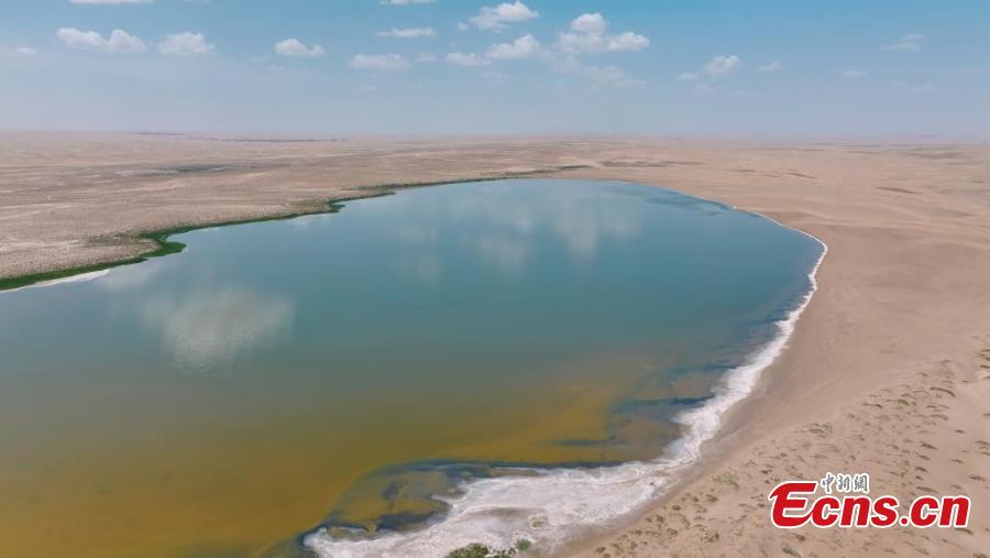 The blue sky is reflected in the surface of the lake on the edge of the Badain Jaran Desert in Alxa League, Inner Mongolia Autonomous Region in June. (Photo: China News Service/ Zhang Leyuan)