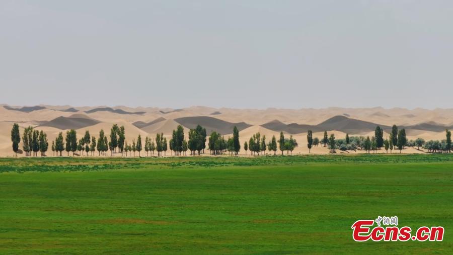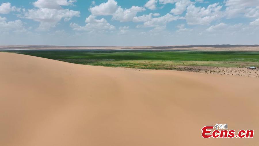 Green grass grows in the Badain Jaran Desert in Alxa League, Inner Mongolia Autonomous Region in June. (Photo: China News Service/ Zhang Leyuan)