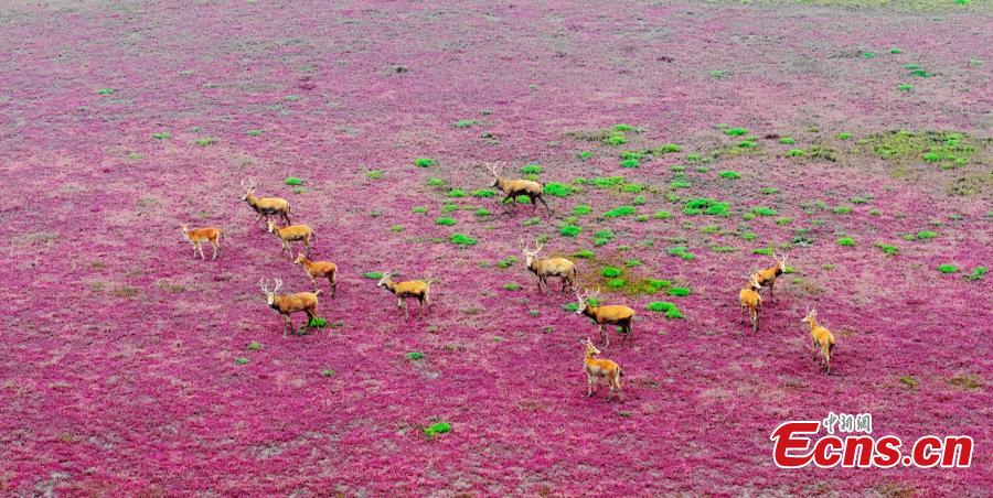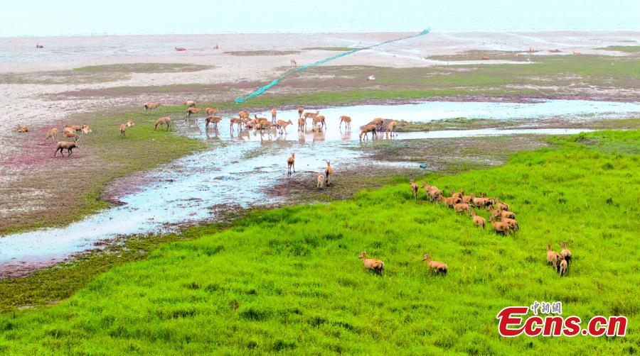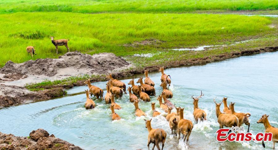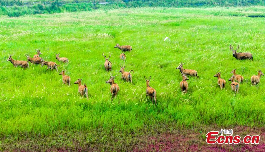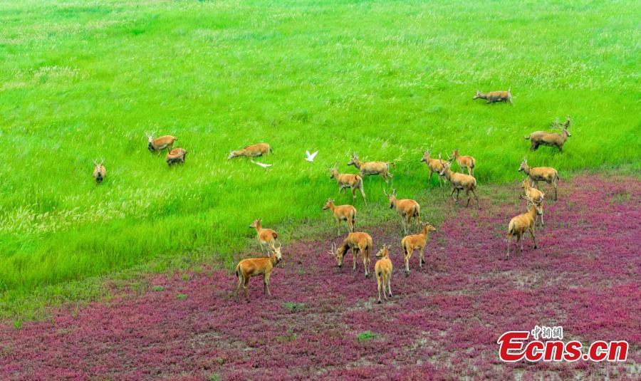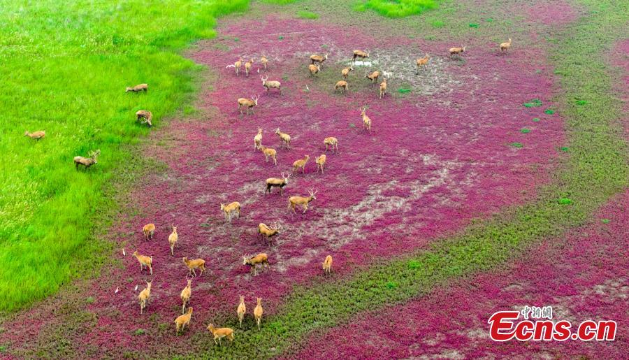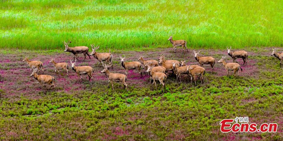 Wild elks, a national first-class protected species, roost and forage among the colorful vegetation, in the Tiaozini wetland in Dongtai, Yancheng City, East China's Jiangsu province on June 23. (Photo/VCG)