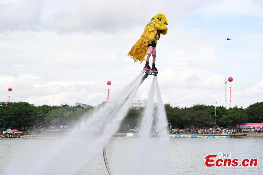 Lion dance performances are staged on the water to cheer for a dragon boat race at Huayang Lake National Wetland Park, Mayong Town, Dongguan City, Guangdong Province on June 23. (Photo: China News Service/ Chen Chuhong)