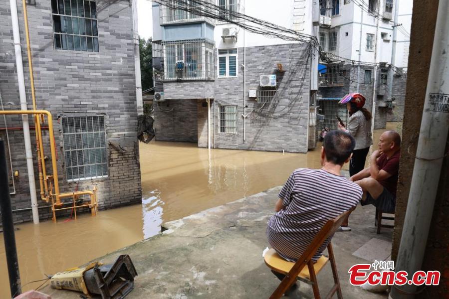 Residents along the river observe the water conditions from their doorsteps, June 26, 2024. (Photo: China News Service/ Lin Xin)