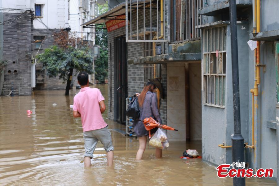 Residents wade through water to return home along the Liujiang River, June 26, 2024. (Photo: China News Service/ Lin Xin)
