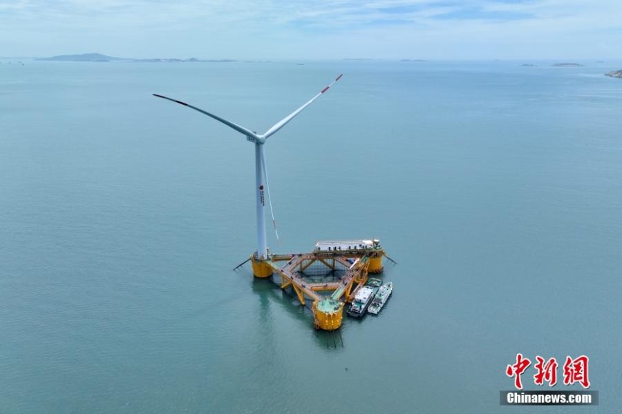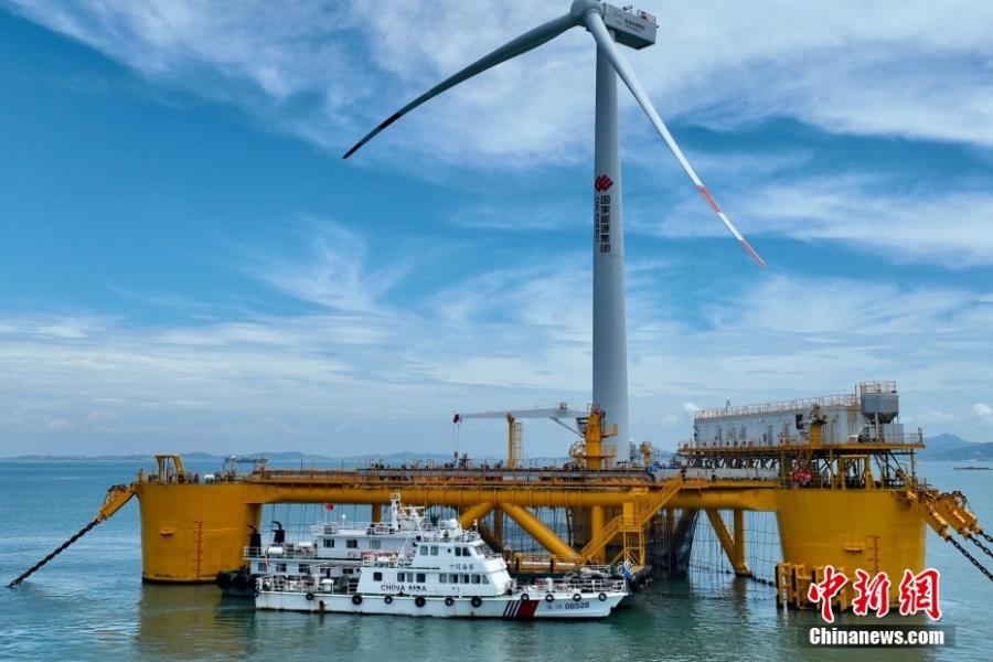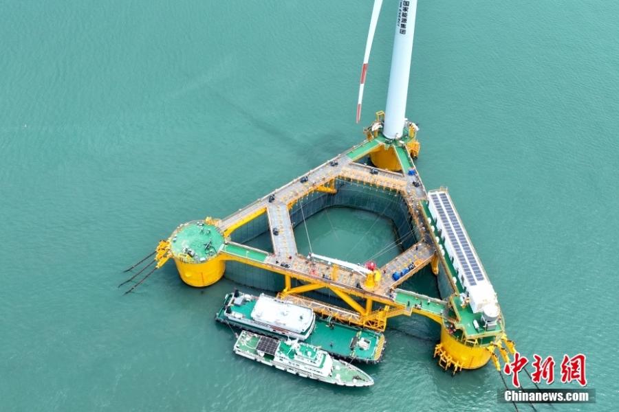The offshore wind power facility was put into operation in Fujian province on Friday. With a new energy digital platform, the project is the first to achieve integrated monitoring of "floating wind power + deep-sea aquaculture", enabling remote monitoring and unattended operation.
