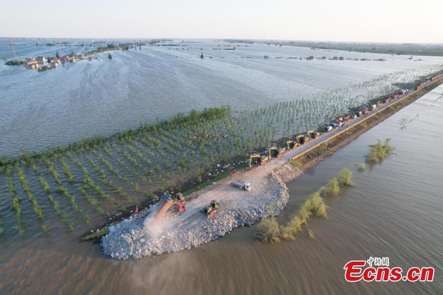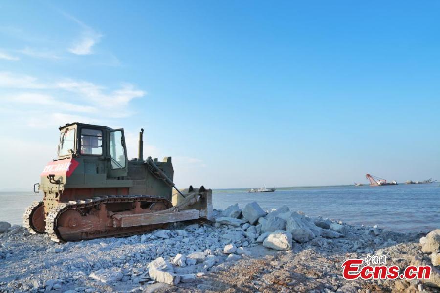 Bulldozers pushed stones into the breach at dike of Dongting Lake in Yueyang City, Hunan Province, July 6, 2024. (Photo: China News Service/Yang Huafeng)