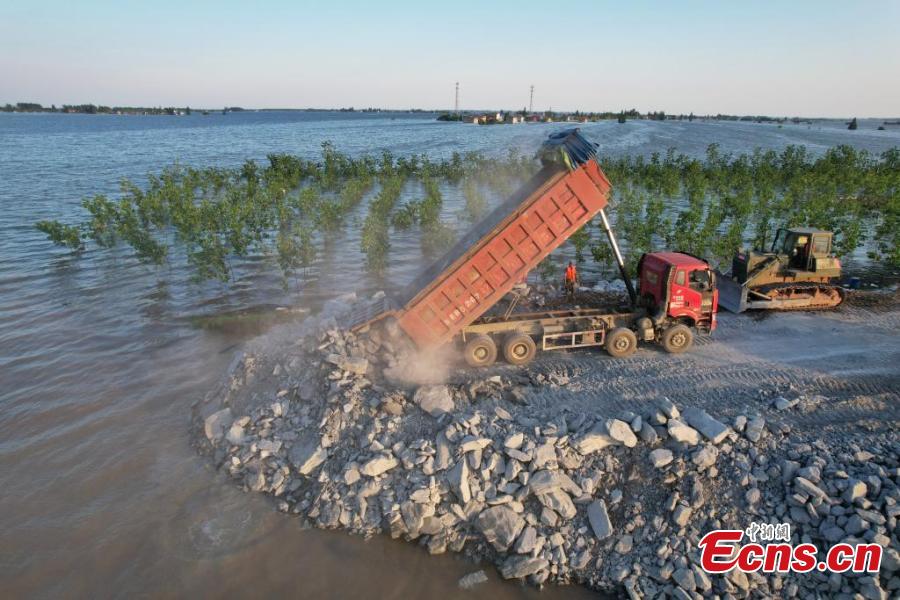 Trucks dump stones into the breach at dike of Dongting Lake in Yueyang City, Hunan Province, July 6, 2024. (Photo: China News Service/Yang Huafeng)