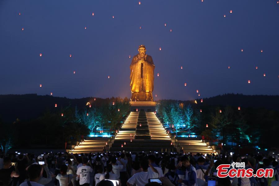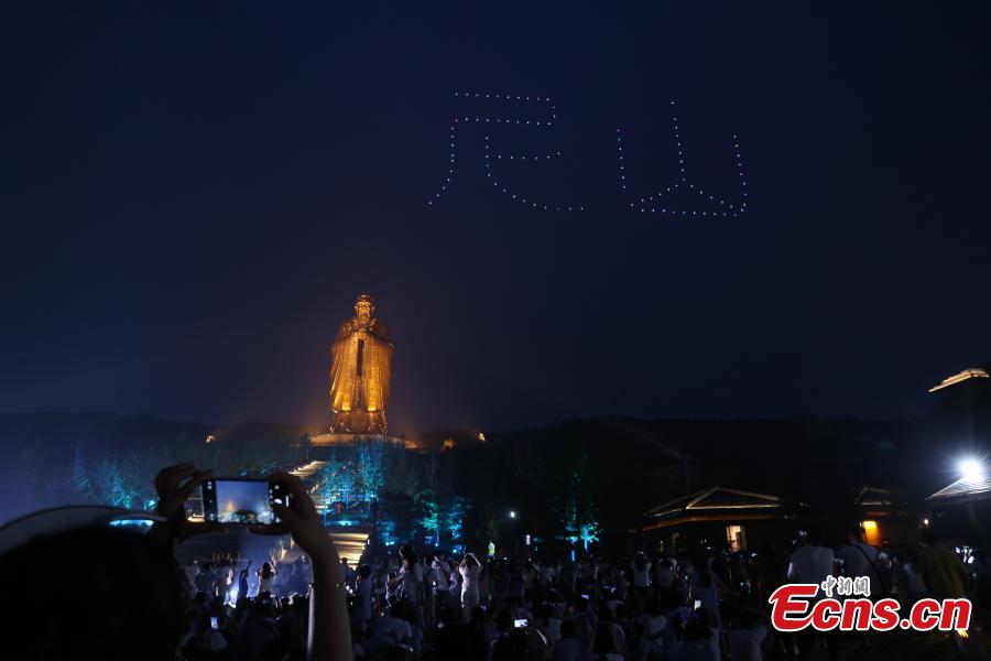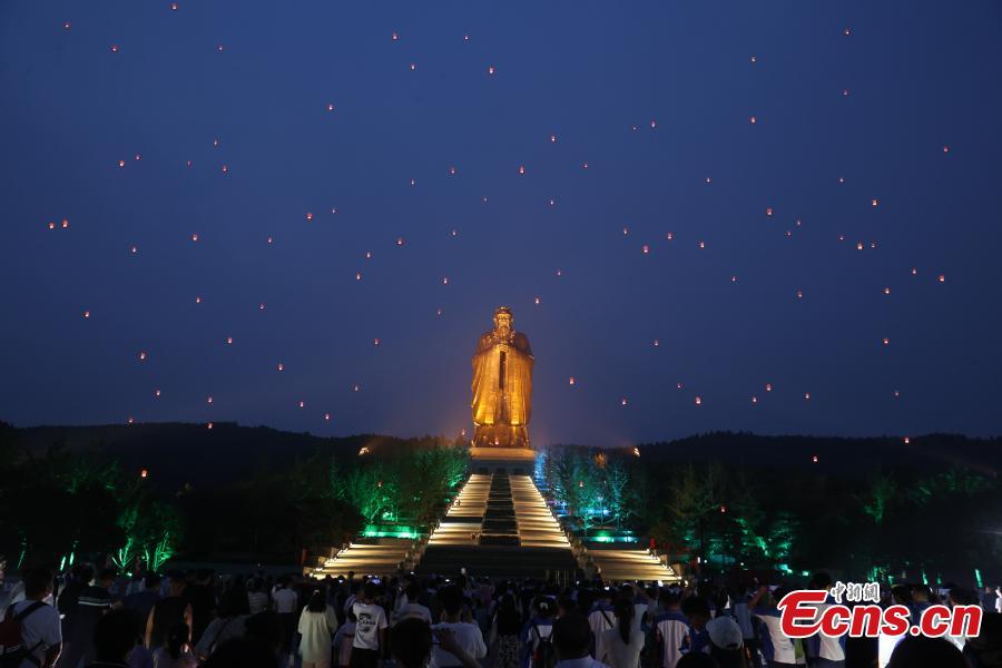 A giant statue of Chinese sage Confucius (551 B.C.-479 B.C.) is illuminated to celebrate the 10th Nishan Forum on World Civilizations in Qufu, east China's Shandong Province, July 10, 2024. (Photo: China News Service/Jiang Qiming)