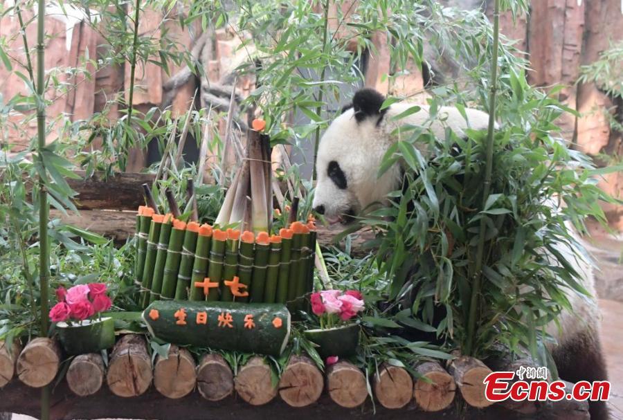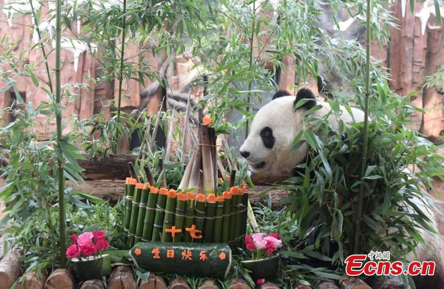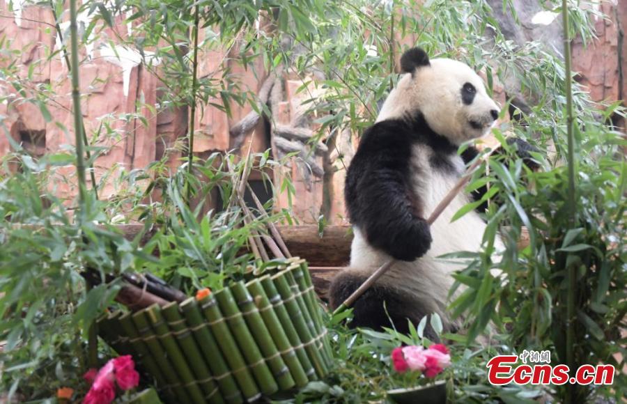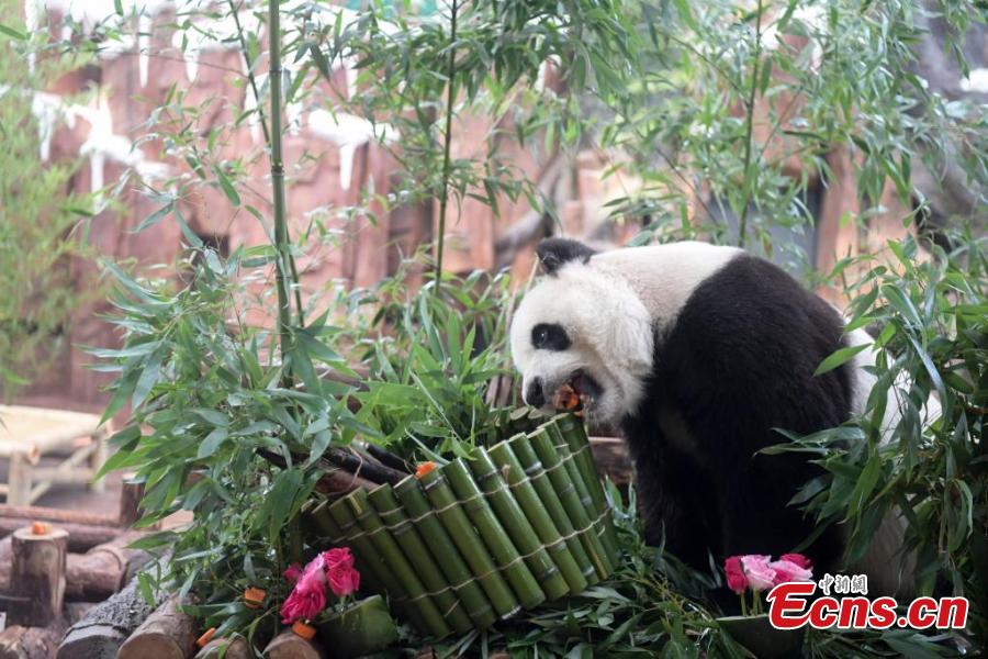 Giant panda Hua Ao enjoys a special cake made of bamboo shoots to celebrate its 17th birthday at Jinan Zoo, east China's Shandong Province, July 14, 2024. (Photo: China News Service/Zhang Yong)