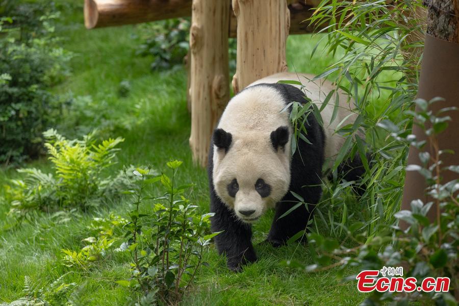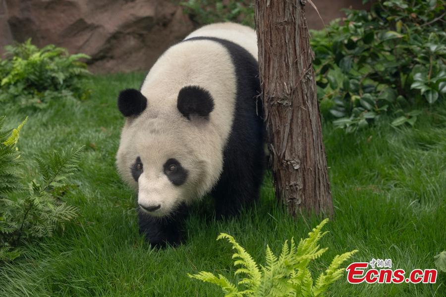 Photo released by San Diego Zoo Wildlife Alliance on July 19, 2024 shows Xin Bao playing at her new home at the San Diego Zoo in San Diego, California, the United States. (Photo provided to China News Service)