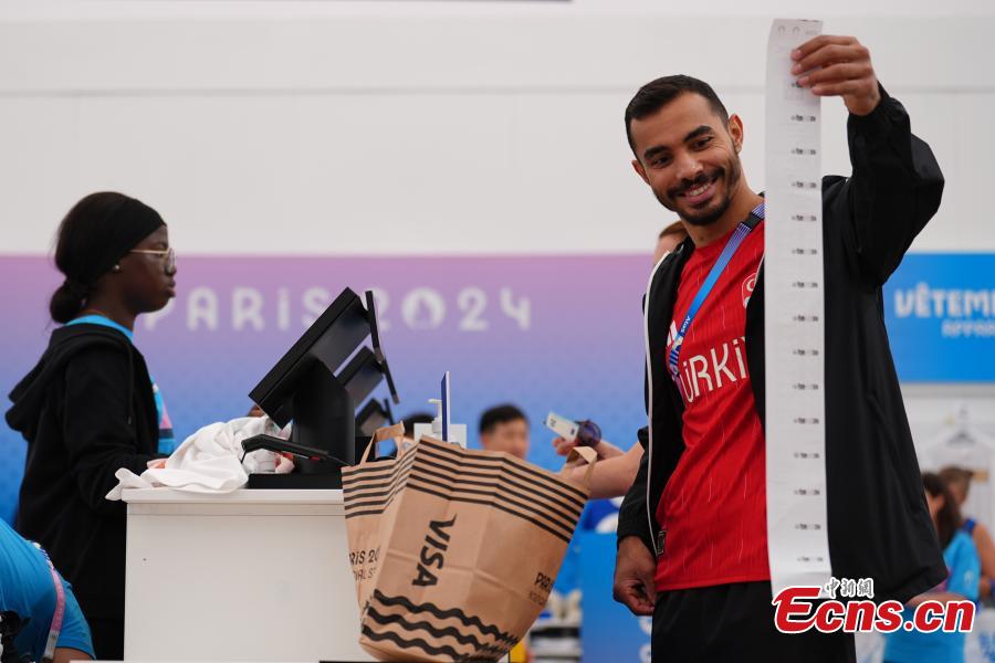 Athletes shop at a souvenir store inside the Olympic Village in Paris, France, July 21, 2024. (Photo: China News Service/Zhao Wenyu)