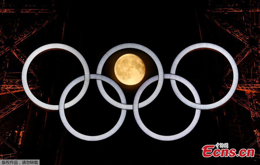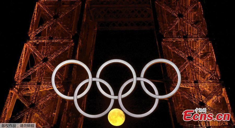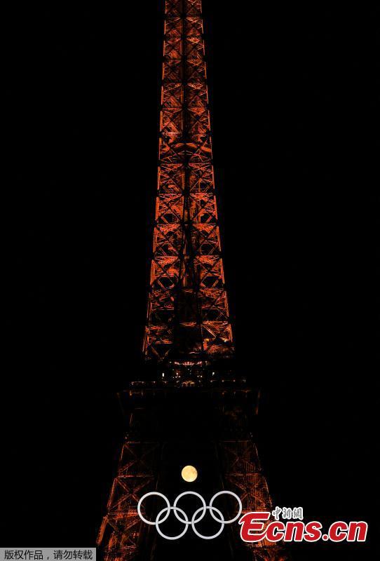 The moon is pictured with the Olympic rings on the Eiffel Tower ahead the Paris 2024 Olympic and Paralympic Games, France, July 23, 2024. (Photo/Agencies)