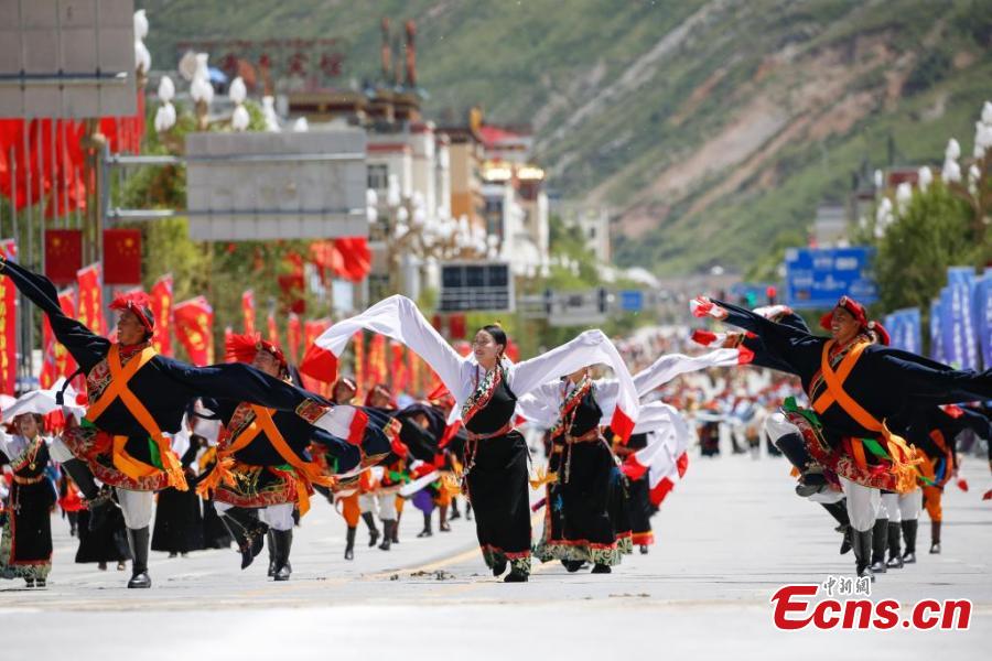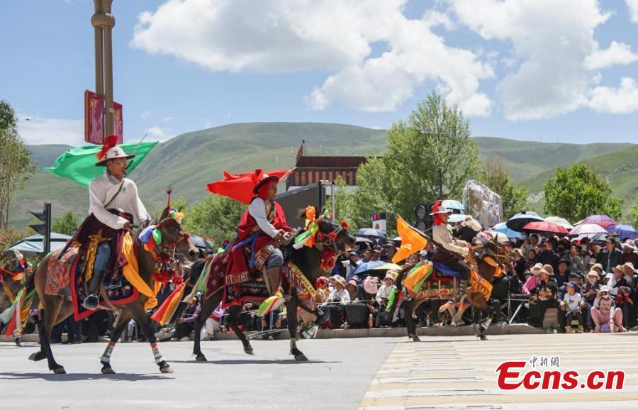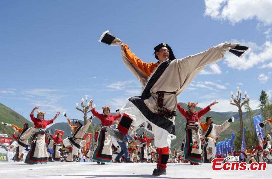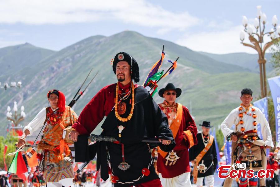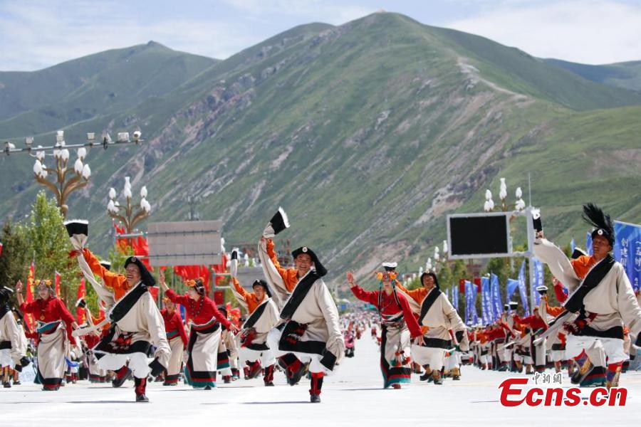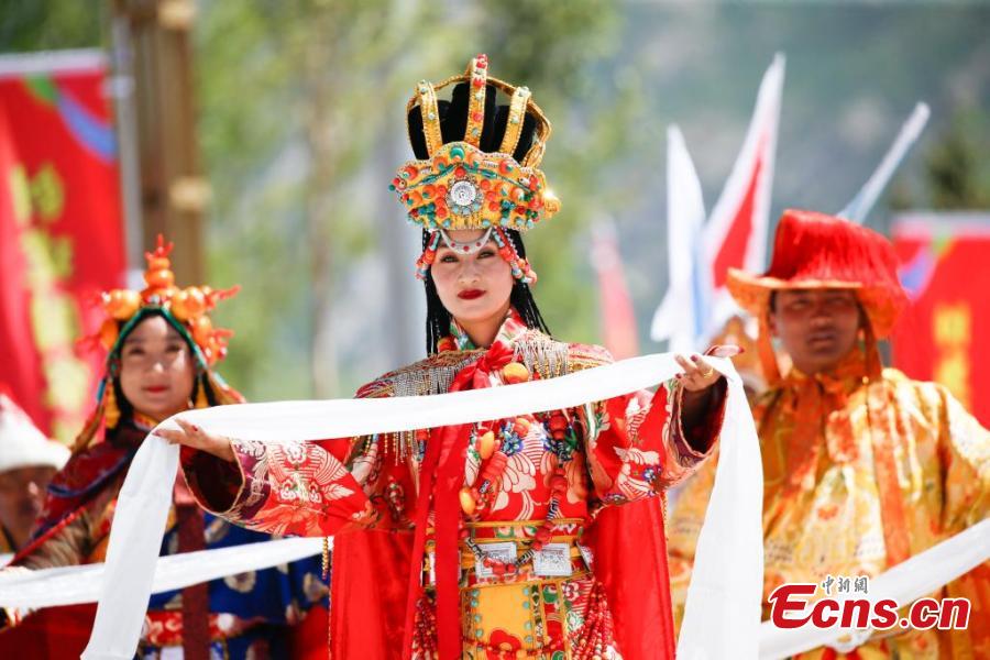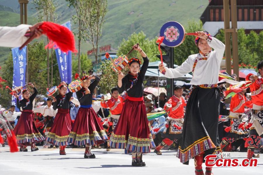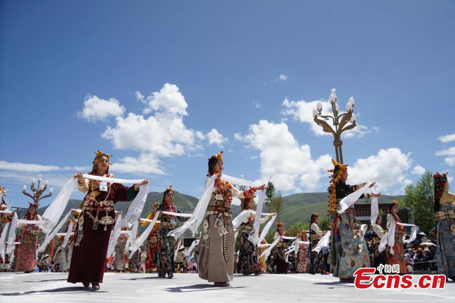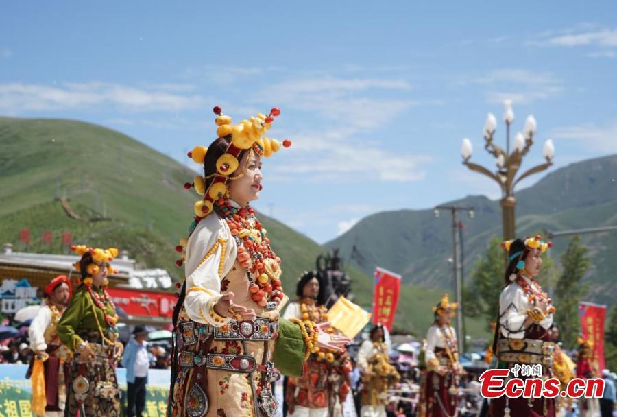 Artist dressed in Kangba costumes, a national intangible cultural heritage, perform to showcase unique Kangba culture in Yushu Tibetan Autonomous Prefecture, northwest Qinghai Province, July 24, 2024. (Photo: China News Service/Ma Mingyan)