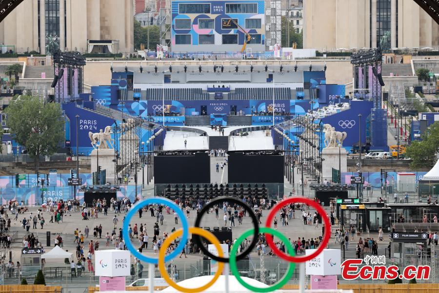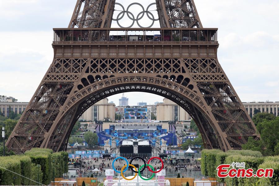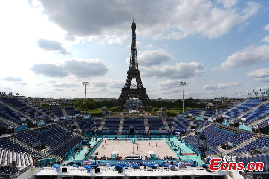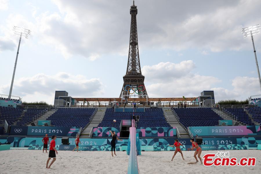 Beach volleyball players attend a training session at the Tour Eiffel stadium that will host the beach bolleyball on the Champs-de-Mars ahead of the Paris 2024 Olympic Games, France, July 24, 2024. (Photo: China News Service/Sheng Jiapeng)
