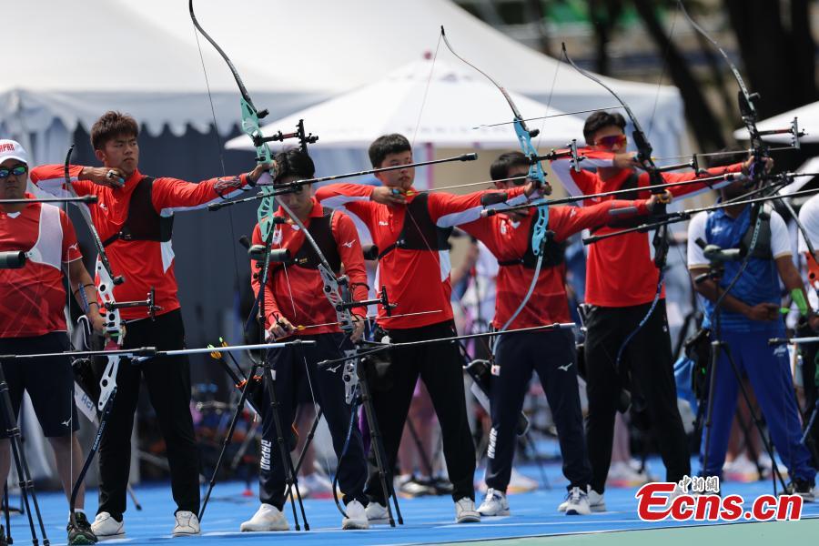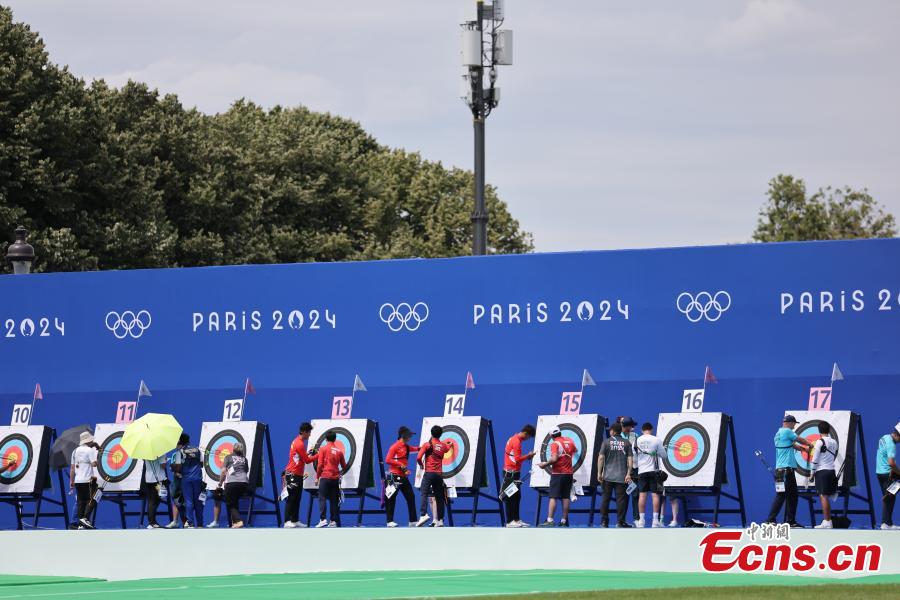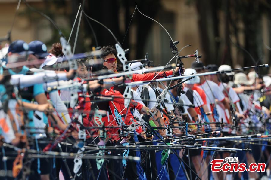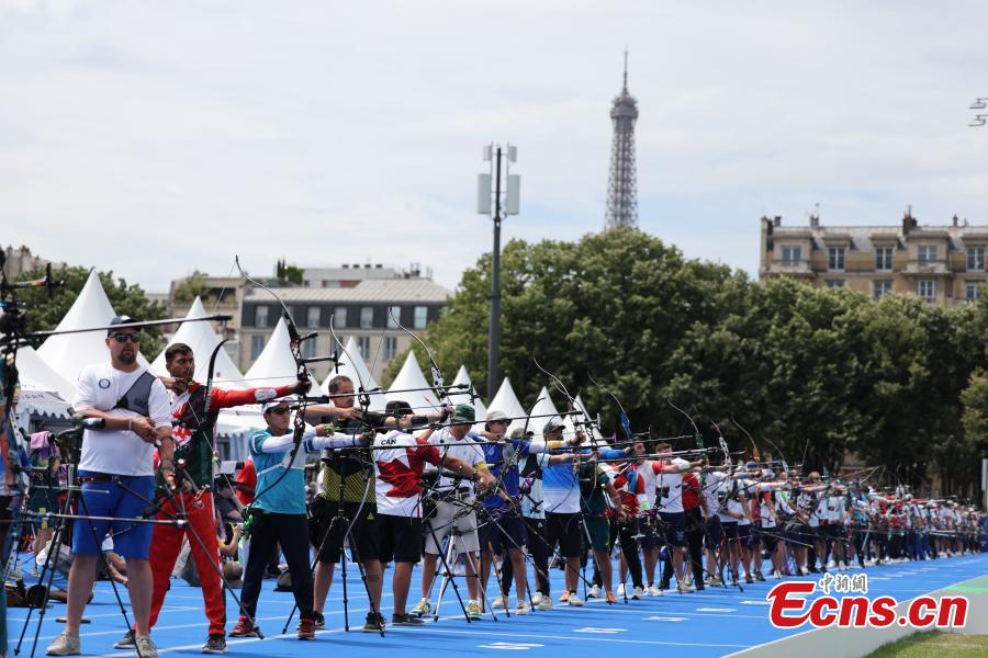 Athletes compete during the men's individual ranking round of archery of the Paris 2024 Olympic Games at the Esplanade des Invalides, France, July 25, 2024. (Photo: China News Service/Sheng Jiapeng)