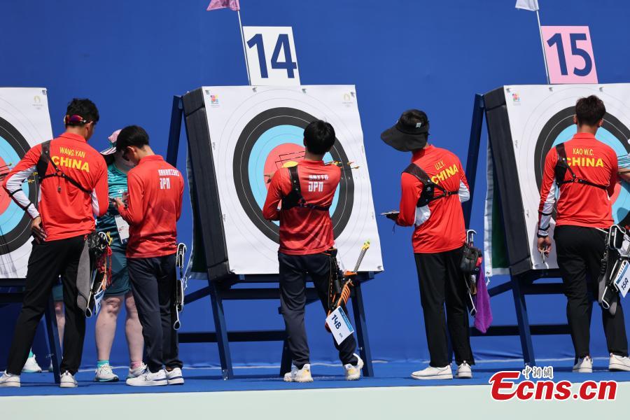 Athletes check their scores during the men's individual ranking round of archery of the Paris 2024 Olympic Games at the Esplanade des Invalides, France, July 25, 2024. (Photo: China News Service/Sheng Jiapeng)
