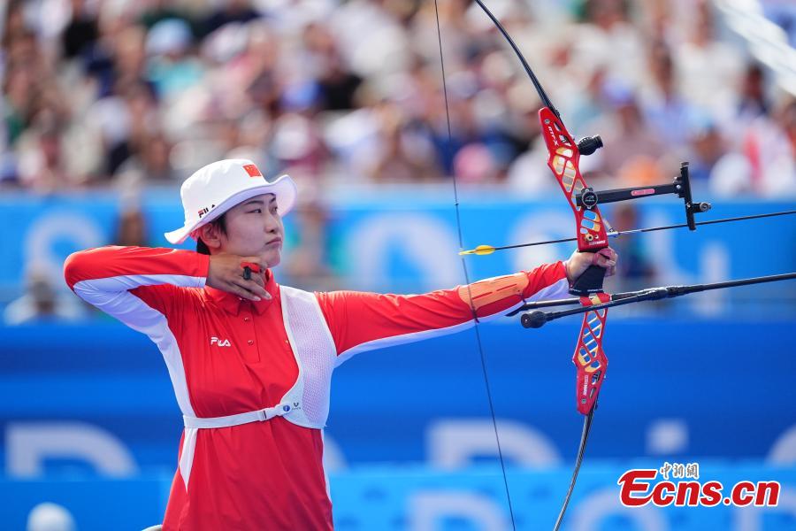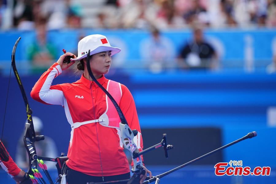 Li Jiaman of team China competes during the women's team gold medal match between South Korea and China of archery event at the Paris 2024 Olympic Games in Paris, France, on July 28, 2024. (Photo: China News Service/Chen Wenyu)