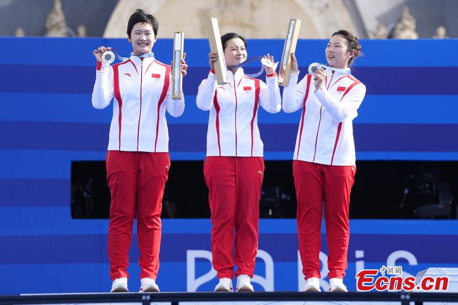 Members of team China celebrate during the awarding ceremony at the Place des Invalides as they win silver in women's archery at the Paris Olympics, France, July 28, 2024. (Photo: China News Service/Chen Wenyu)