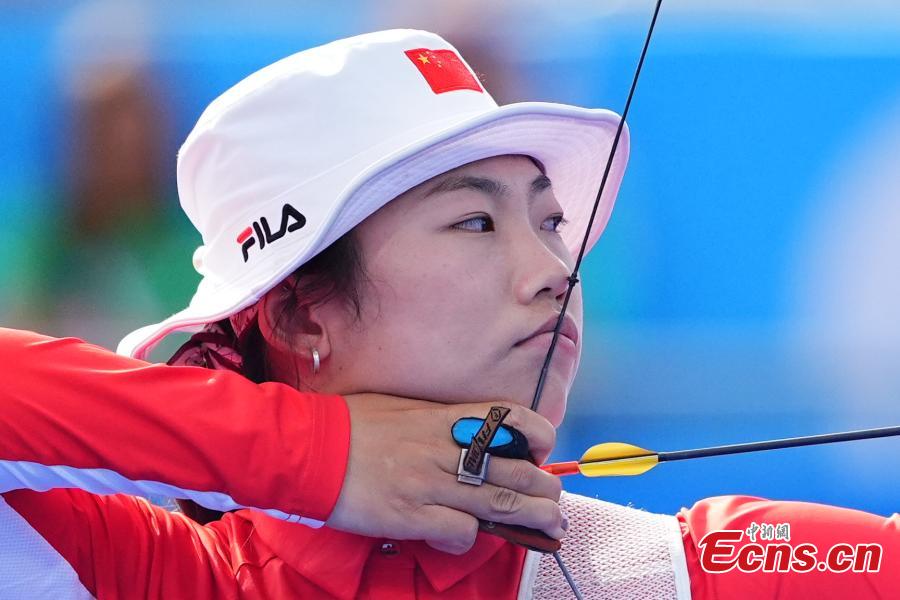 An Qixuan of team China competes during the women's team gold medal match between South Korea and China of archery event at the Paris 2024 Olympic Games in Paris, France, on July 28, 2024. (Photo: China News Service/Chen Wenyu)