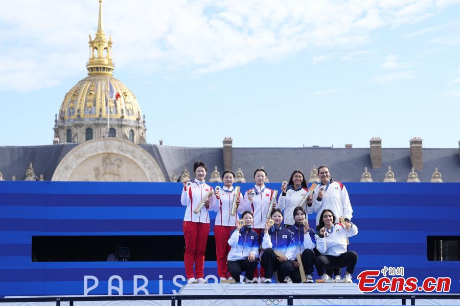 Medalists pose during the awarding ceremony for women's team of archery event at the Paris 2024 Olympic Games in Paris, France, on July 28, 2024. (Photo: China News Service/Chen Wenyu)