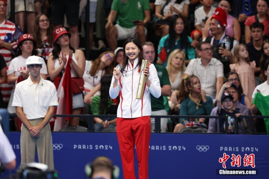 Silver medalist Tang Qianting of China shows the medal during the victory ceremony for the women's 100m breaststroke of swimming at the Paris 2024 Olympic Games in Paris, France, July 29, 2024.Tang took the silver medal in 1:05.54.(Photo: China News Service/Fu Tian)