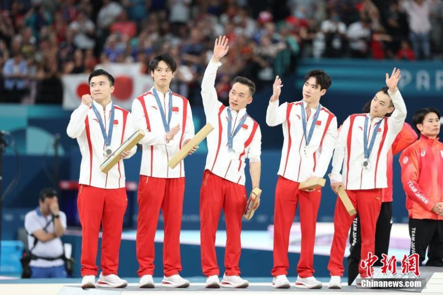 Team China's silver medal winners wave during the awarding ceremony after the men's team artistic gymnastics final at the Paris Olympic Games, France, July 29, 2024. (Photo: China News Service/Sheng Jiapeng) Team China won the silver medal in the Paris Olympics men's team artistic gymnastics finalheld at the Bercy Arena on Monday.
