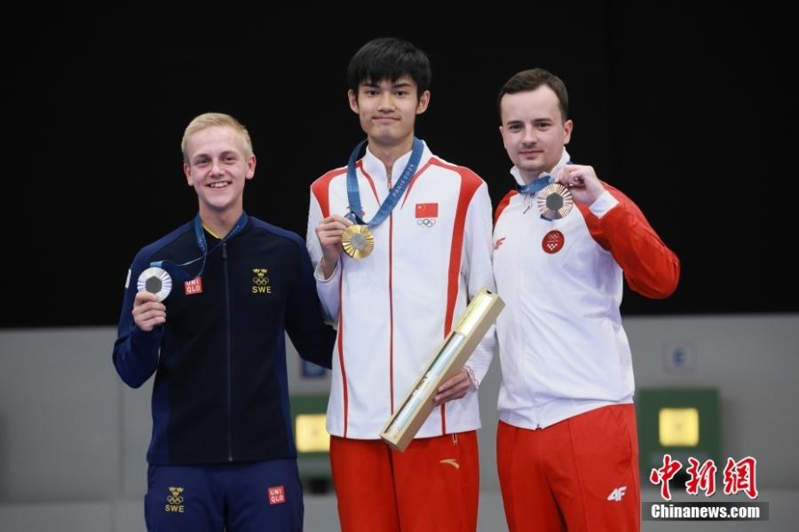 Gold medalist Sheng Lihao (C) of China, silver medalist Victor Lindgren (L) of Sweden and bronze medalist Miran Maricic of Croatia pose for photos during the awarding ceremony after the men’s 10m air rifle final at the Paris 2024 Olympic Games in Chateauroux, France, July 29, 2024. (Photo provided to China News Service)