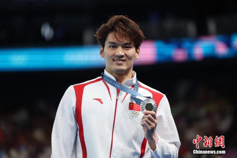 Silver medalist Xu Jiayu of China shows the medal during the victory ceremony for the men's 100m backstrokeof swimming at the Paris 2024 Olympic Games in Paris, France, July 29, 2024. Xu took the silver medal in 52.32.(Photo: China News Service/Fu Tian)