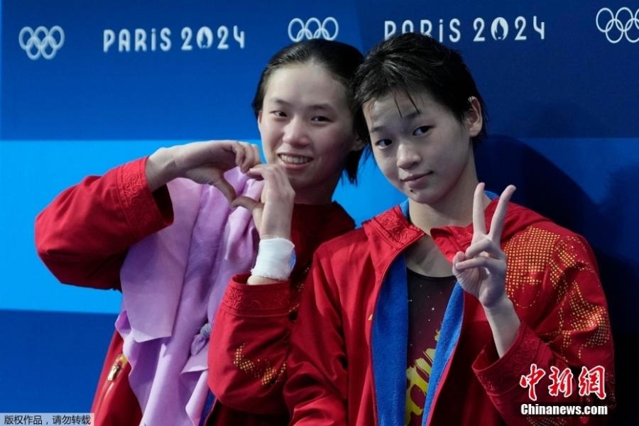 Gold medalists Chen Yuxi (L)/Quan Hongchan of China pose for photos after the women's synchronized 10m platform final of diving at the Paris 2024 Olympic Games in Saint Denis, France, July 31, 2024. (Photo: China News Service/Fu Tian)
