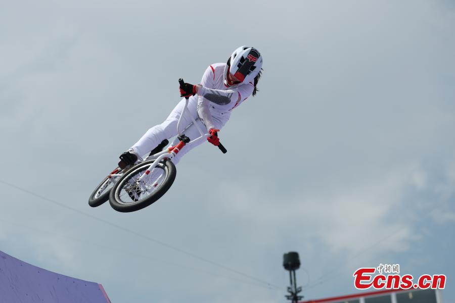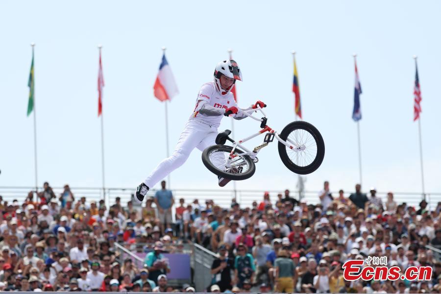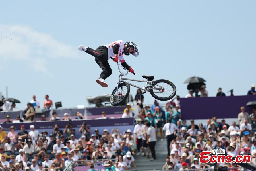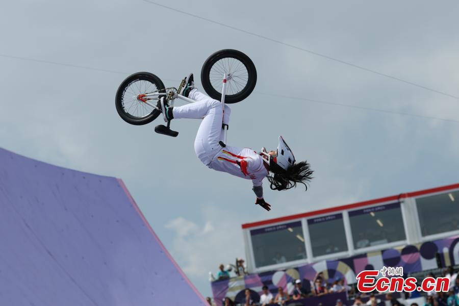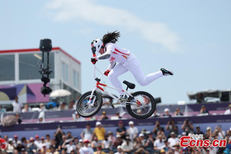 Deng Yawen of China competes during the women's park final of cycling BMX freestyle at the Paris 2024 Olympic Games in Paris, France, July 31, 2024. (Photo: China News Service/Sheng Jiapeng)