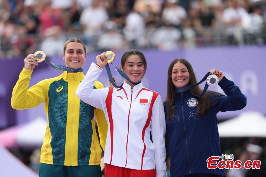 Gold medalistDeng Yawen of of China (centre), Silver medalist Perris Benegas of the USA (L) and Bronze medalist Natalya Diehm of Australiapose for a photoduring the awarding ceremony of the Women's BMX freestyle final at the 2024 Paris Olympic Games, France, July 31, 2024. (Photo: China News Service/Sheng Jiapeng)