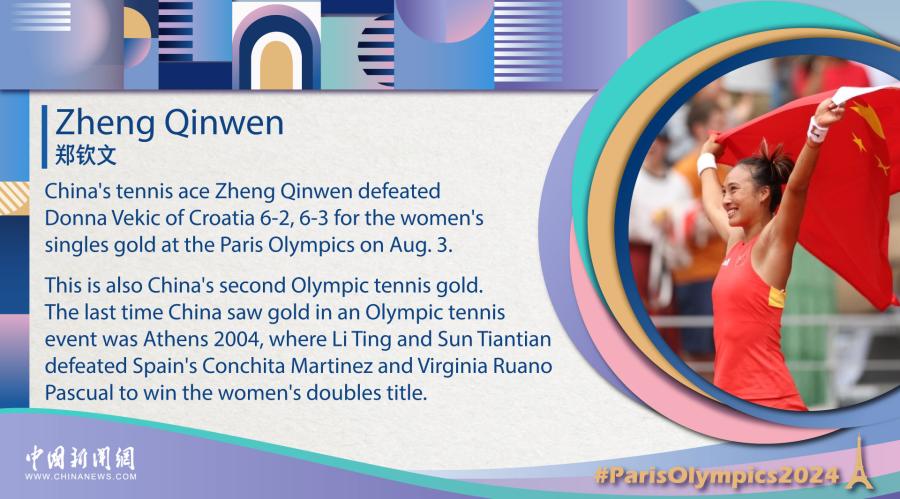 China's tennis ace Zheng Qinwen became the first Asian-born player to win a gold medal in a tennis singles event at the Olympics after defeating Croatia's Donna Vekic 6-2, 6-3 in the final.