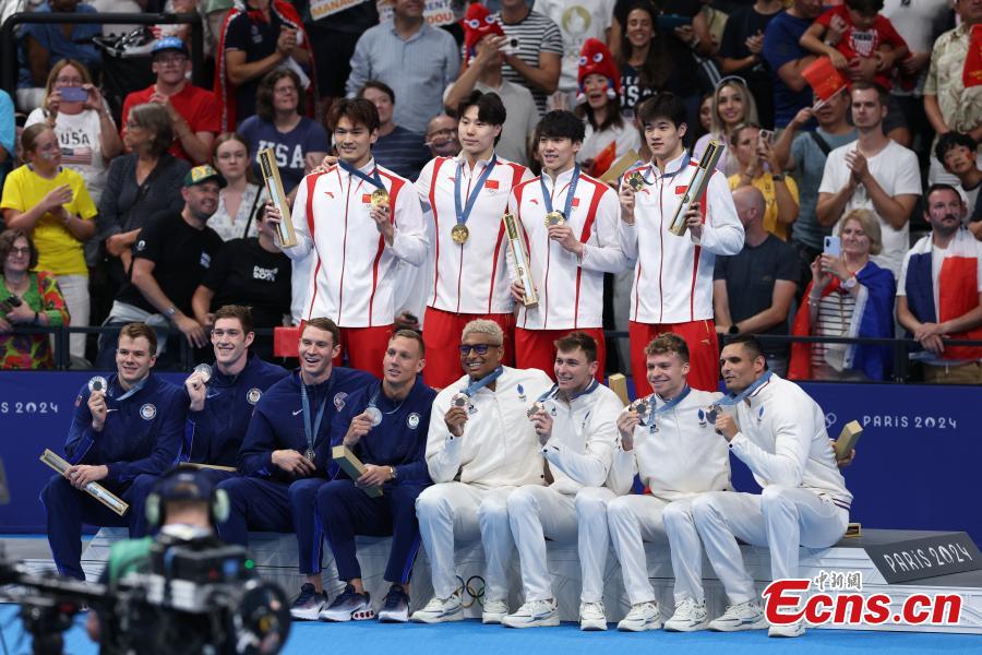 Gold medalists Team China (C), silver medalists Team USA (L) and bronze medalists Team France attend the awarding ceremony for the men's 4 x 100m medley relay of swimming at Paris 2024 Olympic Games, France, Aug. 4, 2024. (Photo: China News Service/Fu Tian)