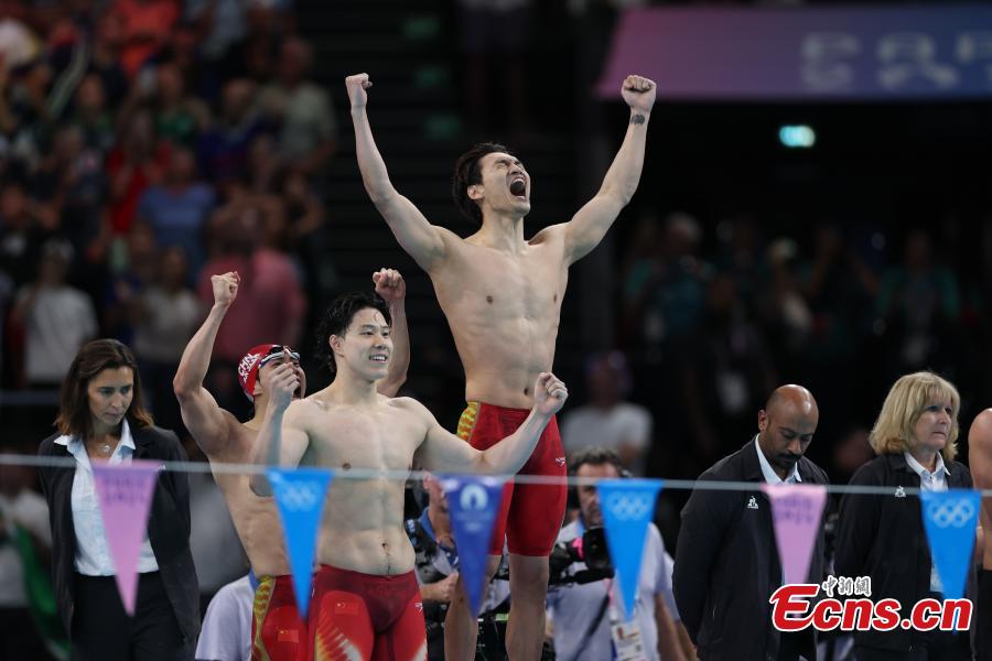 Gold medalists Team China compete during the men's 4 x 100m medley relay of swimming at Paris 2024 Olympic Games, France, Aug. 4, 2024. (Photo: China News Service/Fu Tian)