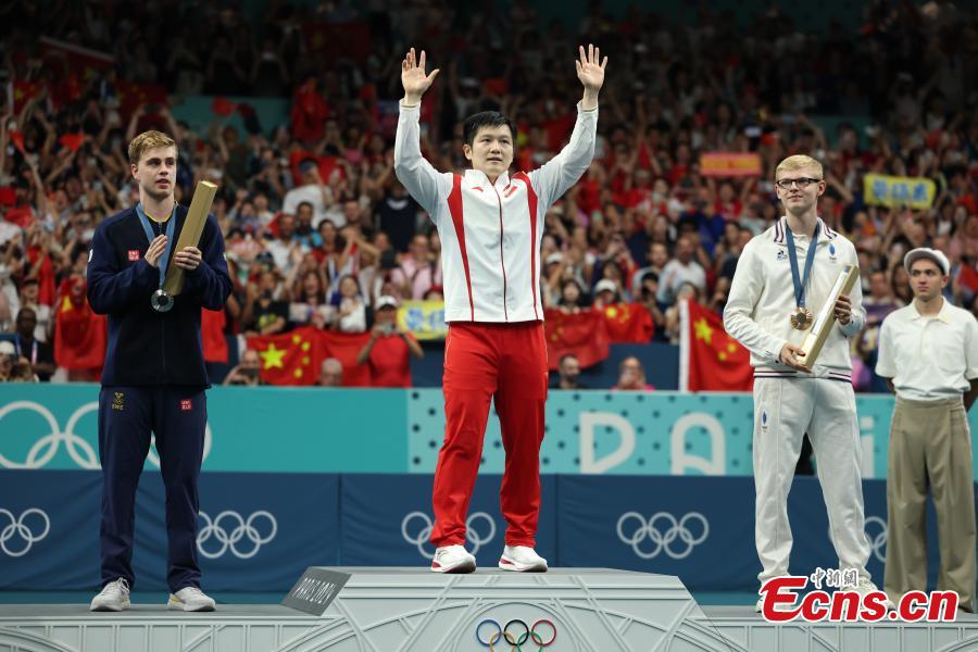 Fan Zhendong of China poses for a photo during the awarding ceremony after the table tennis men's singles final at the Paris Olympics, France, Aug. 4, 2024. (Photo: China News Service/Fu Tian)