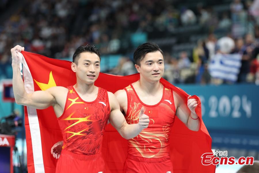 Liu Yang and Zou Jingyuan (L)of China celebrate after the men's rings final of artistic gymnastics at the Paris 2024 Olympic Games, France, Aug. 4, 2024. (Photo: China News Service/Sheng Jiapeng)