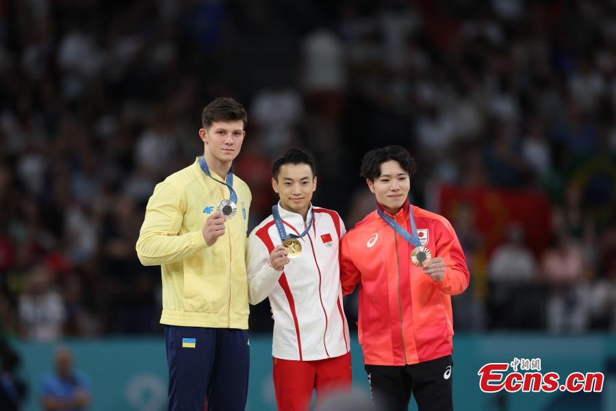Gold medalist Zou Jingyuan (C) of China, silver medalist Illia Kovtun (L) of Ukraine and bronze medalist Oka Shinnosuke of Japan attend the awarding ceremony after the men's parallel bars final of artistic gymnastics at the Paris 2024 Olympic Games, France, Aug. 5, 2024. (Photo: China News Service/Sheng Jiapeng)