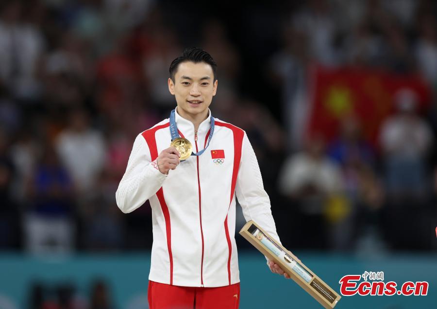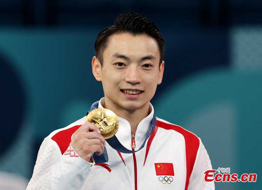 Zou Jingyuan of China poses for a photo during the awarding ceremony after the men's parallel bars final of artistic gymnastics at the Paris 2024 Olympic Games, France, Aug. 5, 2024. (Photo: China News Service/Sheng Jiapeng)